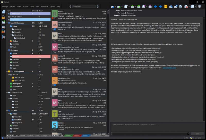 The Bat! Professional เป็นไคลเอนต์อีเมลยอดนิยมที่ช่วยให้ทำงานกับกล่องจดหมายได้ไม่จำกัดจำนวน ภารกิจหลักของโปรแกรมคือการรักษาความปลอดภัยการป้องกันการติดต่อจากการโจรกรรมข้อมูลและการตรวจสอบโดยบุคคลที่สาม ค้างคาว! สามารถจัดการบัญชีอีเมลได้ไม่จำกัดจำนวน และประมวลผลและจัดเก็บข้อความได้ไม่จำกัดจำนวน